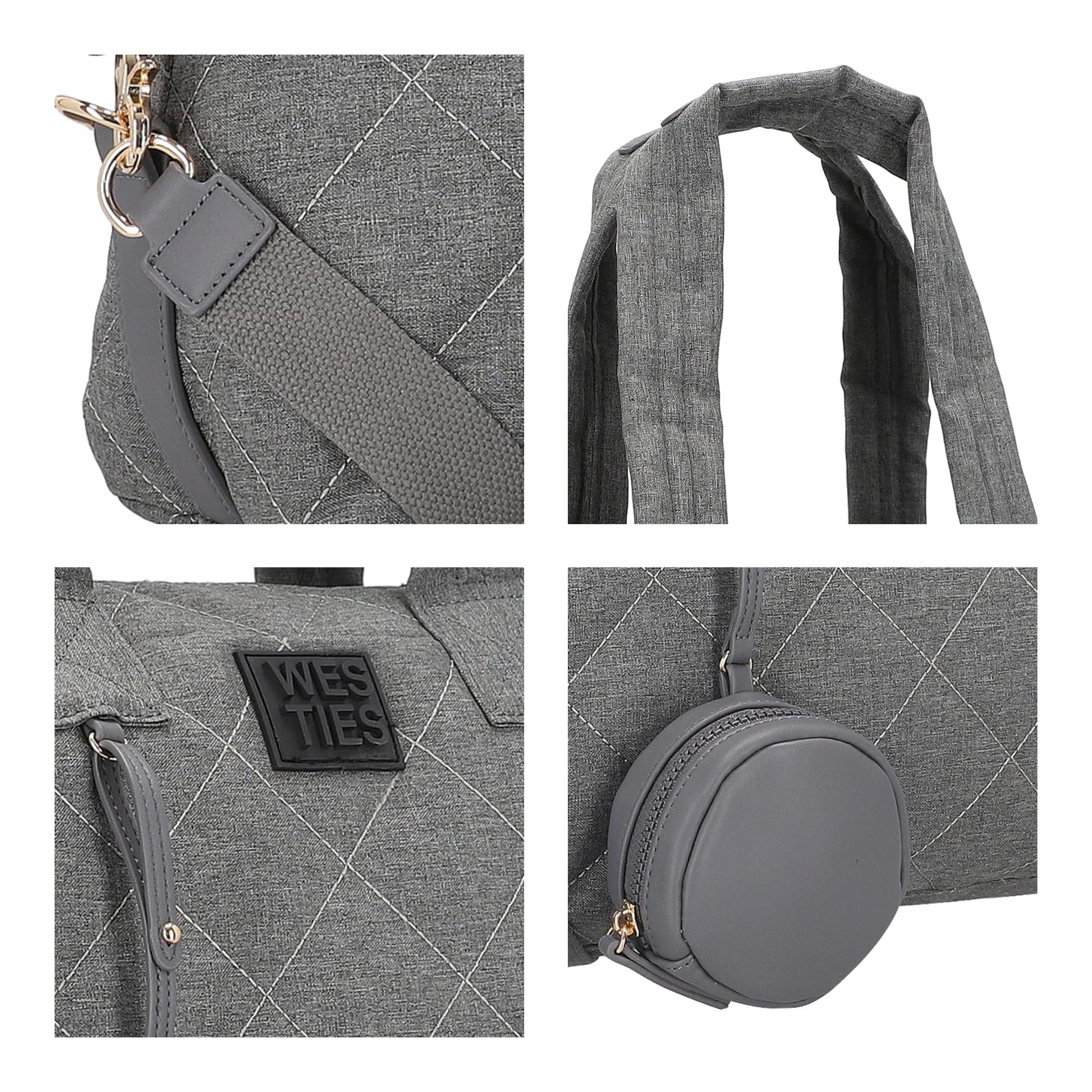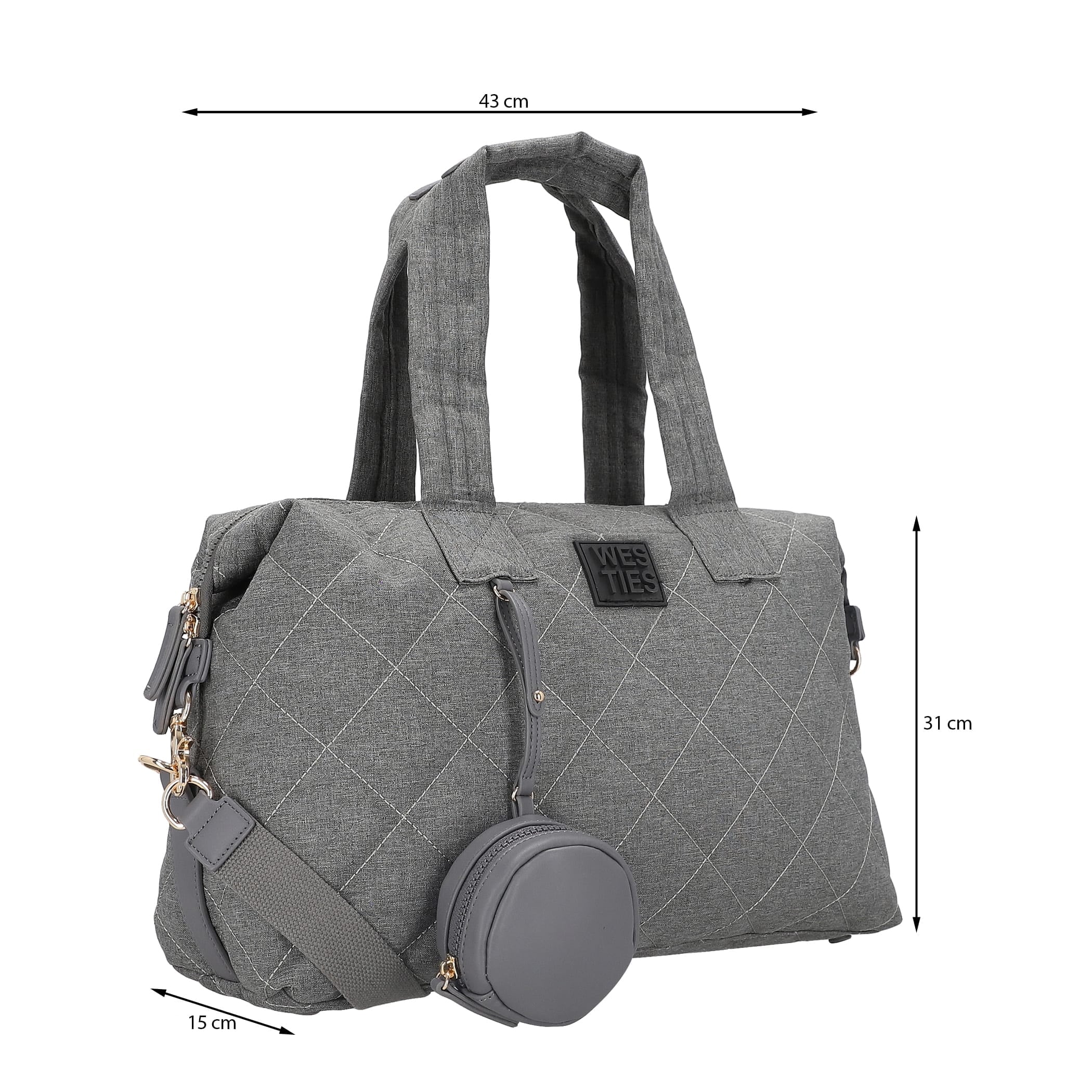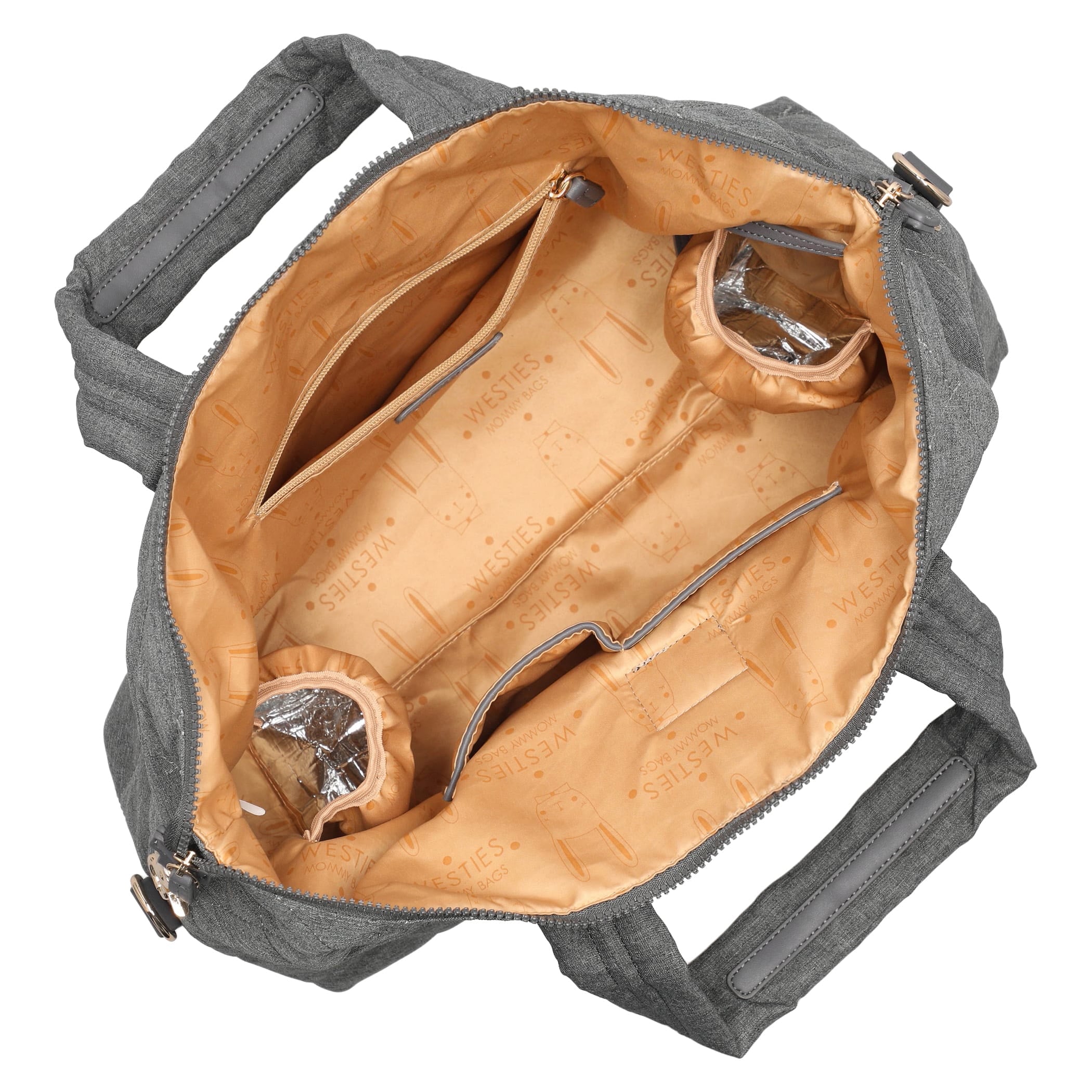 Pañalera Westies para mujer elaborado en material textil con aplicación de bordado, fijación de cierre, forro textil y textura lisa.