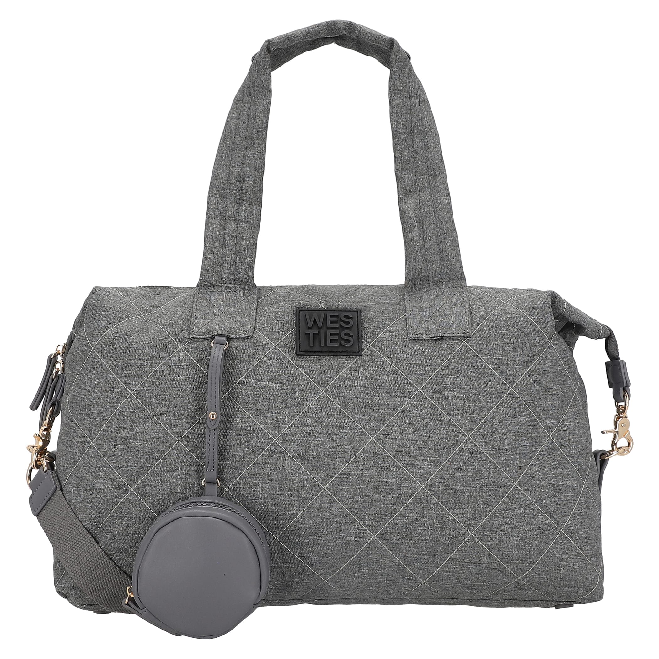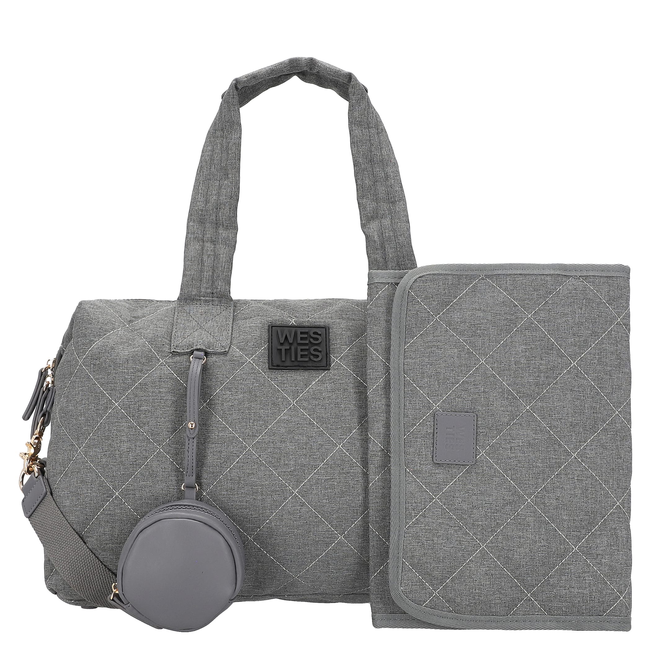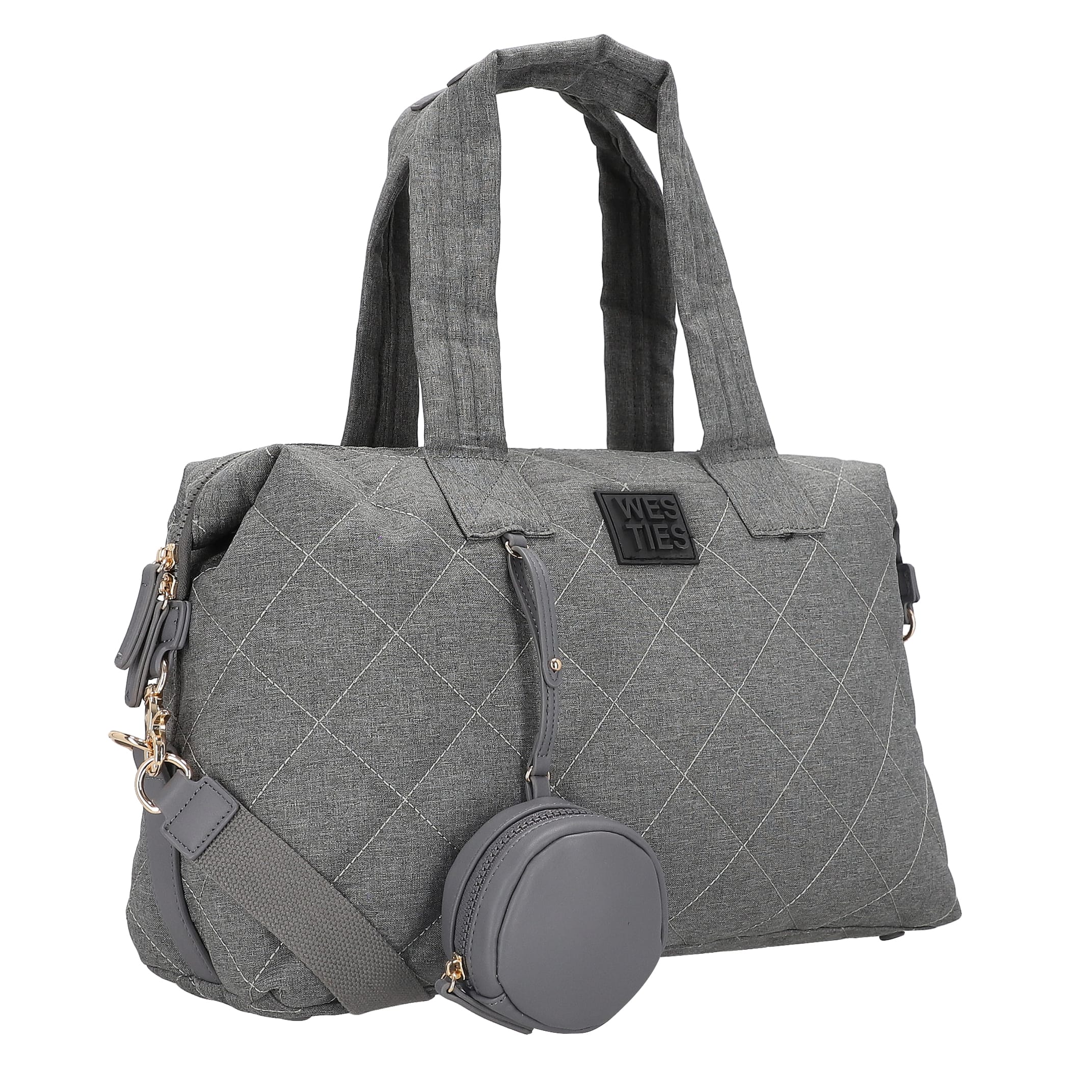 Pañalera Westies para mujer elaborado en material textil con aplicación de bordado, fijación de cierre, forro textil y textura lisa.