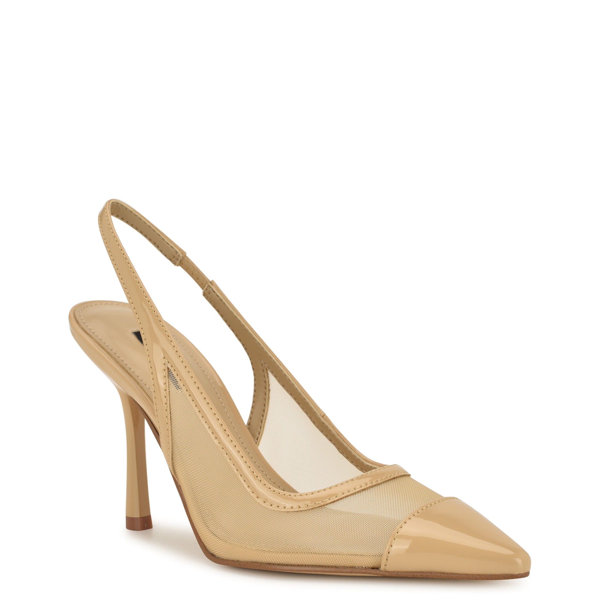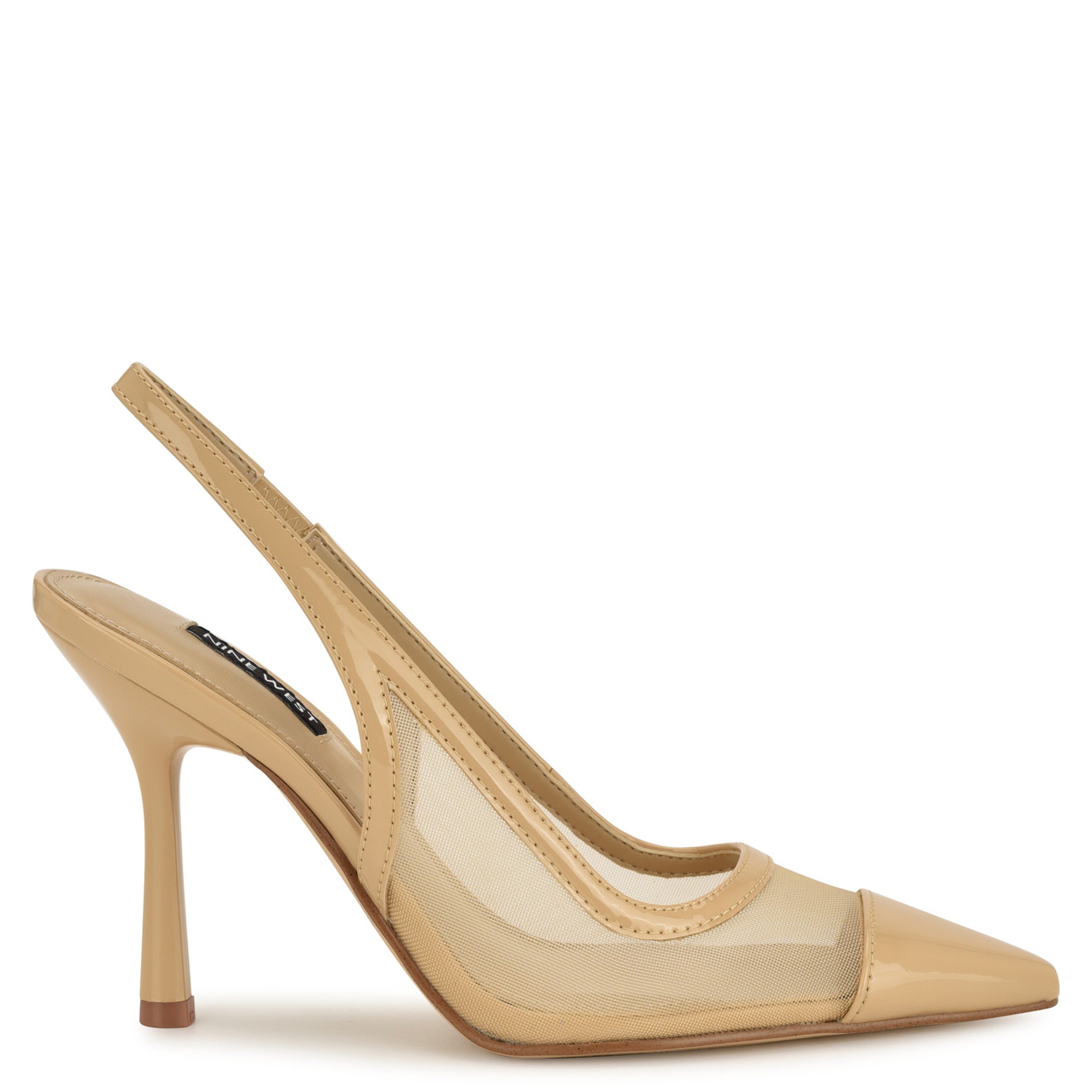 Zapatilla Nine West para mujer elaborada en material textil con estampado liso, fijación de hebilla, punta puntal y textura lisa.
