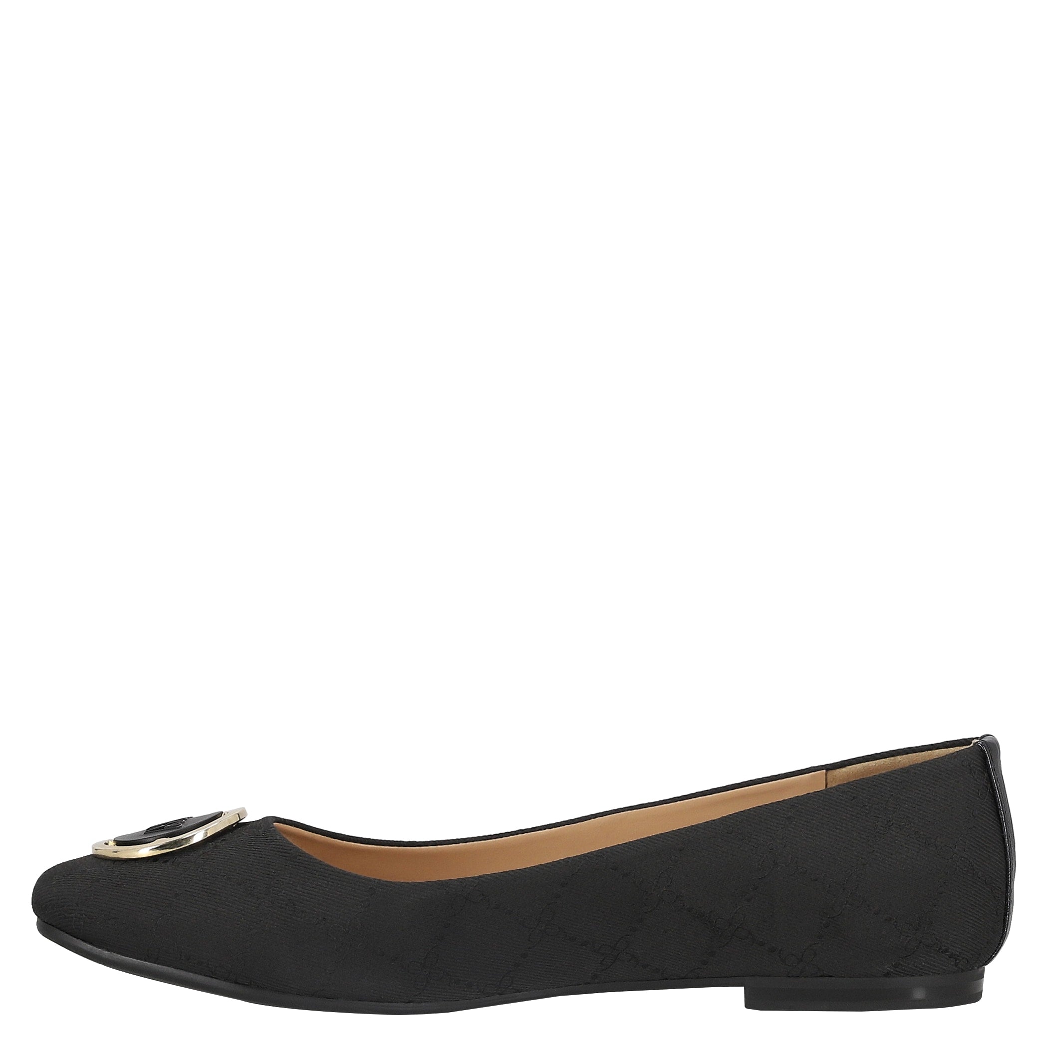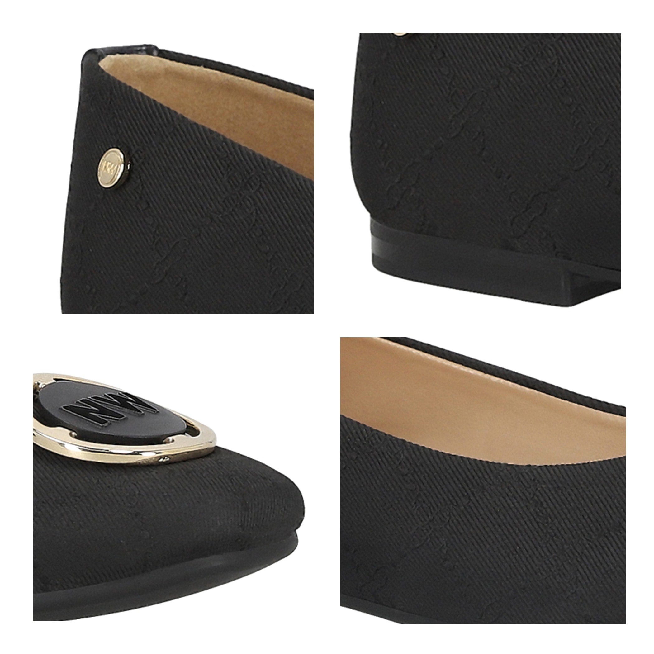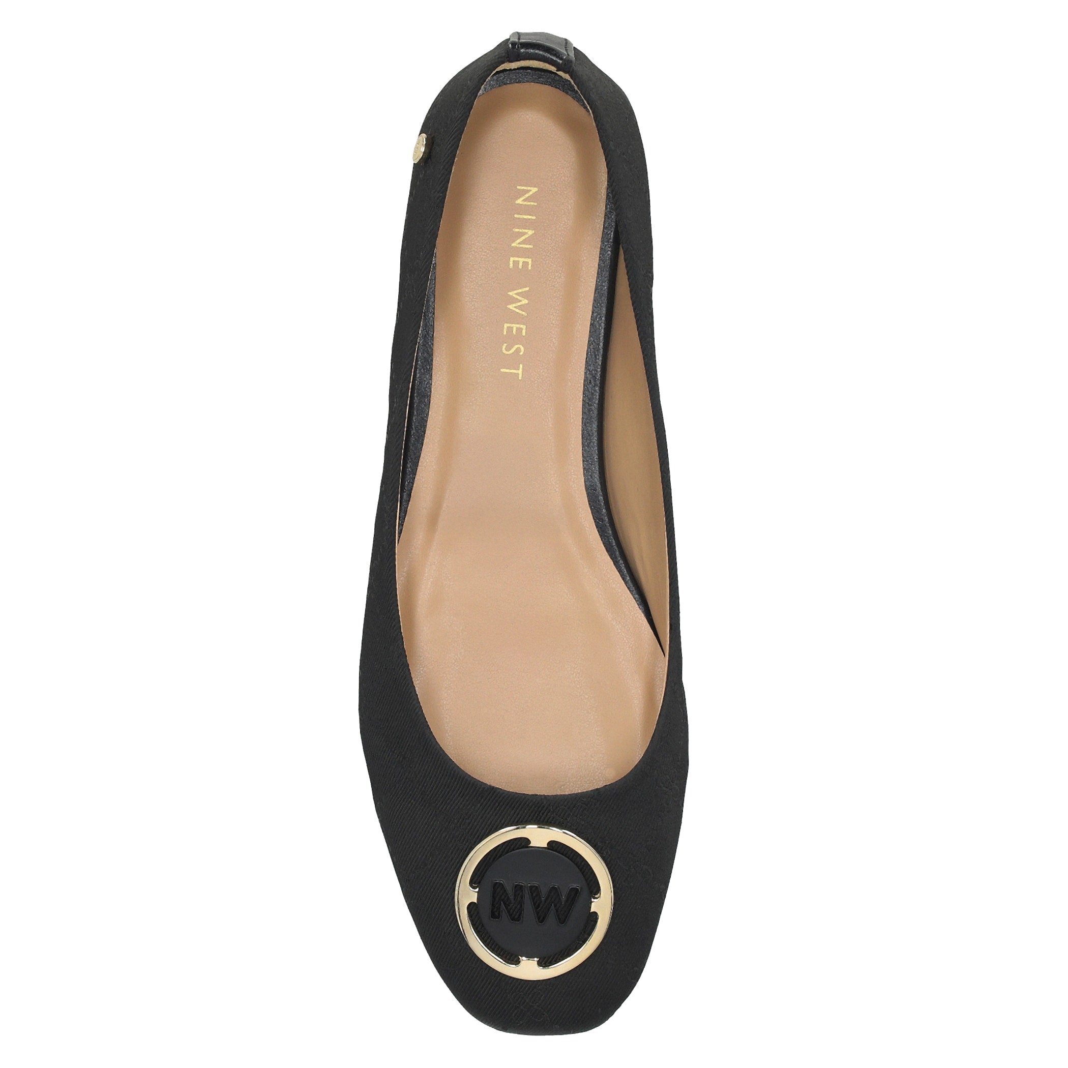 Balerina Nine West para mujer elaborada en material textil monogram con aplicación de herraje, estampado de logotipo, fijación abierta, punta cuadrada, cuña flat y textura lisa.