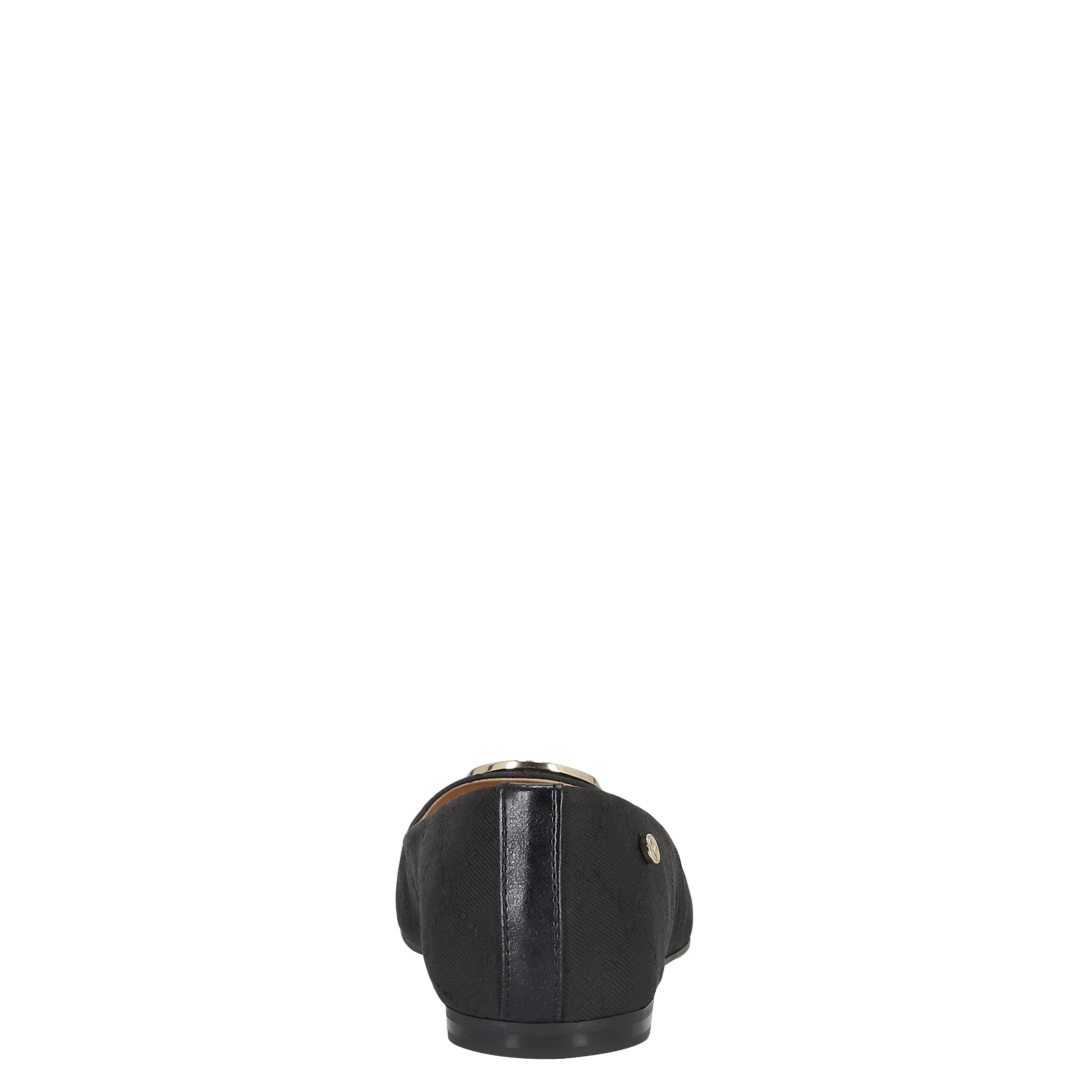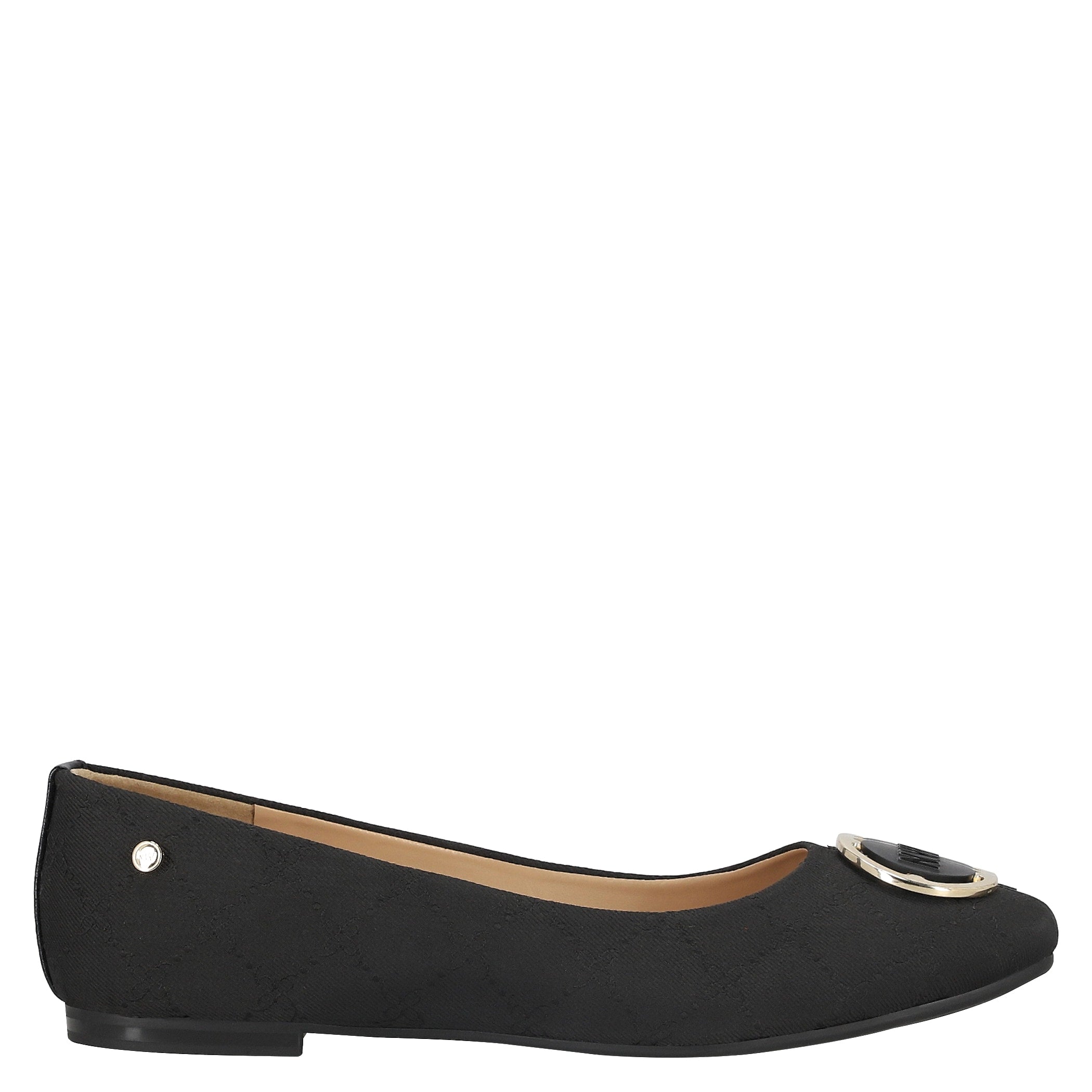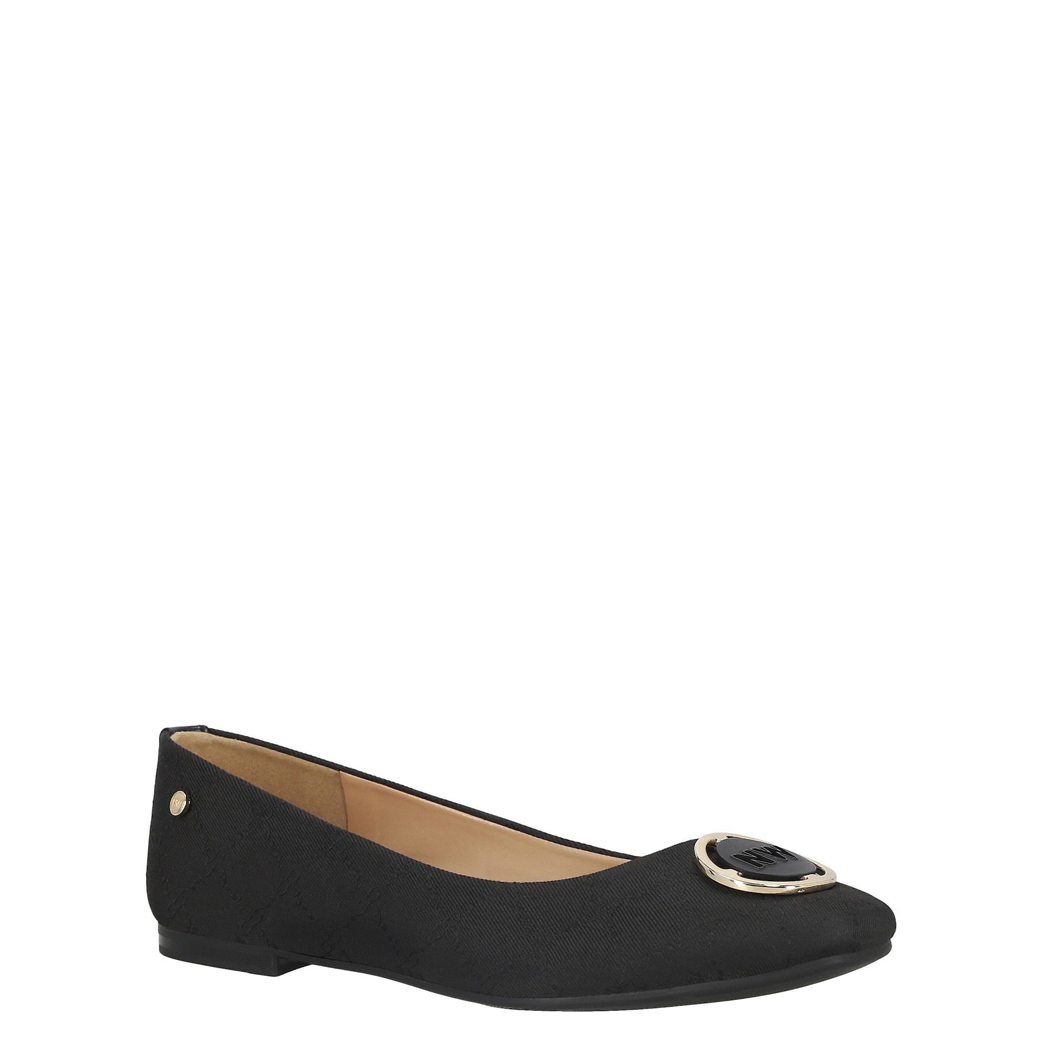 Balerina Nine West para mujer elaborada en material textil monogram con aplicación de herraje, estampado de logotipo, fijación abierta, punta cuadrada, cuña flat y textura lisa.